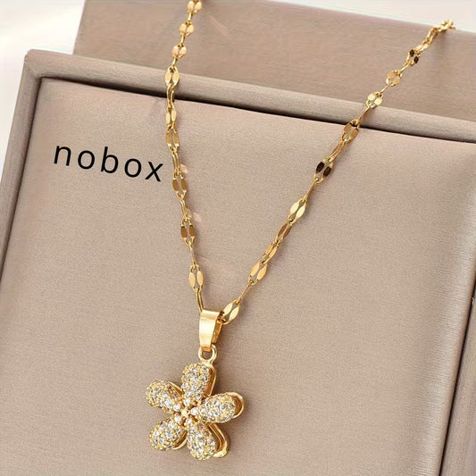 A stainless steel plated cubic three-dimensional lucky five petal flower Rhinestone setting, vintage design fashion trend simple unisex couple street daily party Christmas Halloween versatile necklace pendant