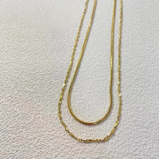 18K Golden Plated Stainless Steel Chain Necklace Set - 2pcs, Simple & Elegant Double Layered Snake and Bead Chain, Versatile for Daily & Party Wear